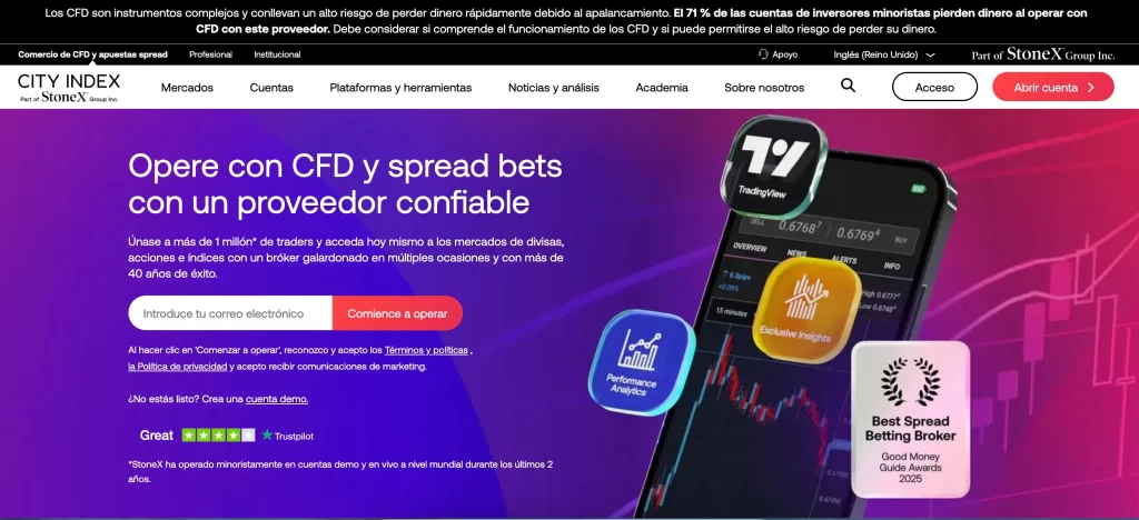 Para comenzar debemos decir que City Index es un broker que se dedica a las inversiones con Índices, Acciones, Forex, Oro, Plata y Materias Primas por medio de contratos por Diferencia. La empresa señala formar parte de StoneX Financial Ltd. Menciona tener ubicación en Reino Unido, pero esta empresa forma parte de la lista negra de organismos como FCSA, CySEC, ASIC, FSC y DFSA.